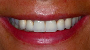 Le Foto 3 e 4 mostrano il marcato miglioramento post-operatorio. Il ripristino della corretta “Dimensione Verticale d’ Occlusione” ha consentito, in primis, di restituire alla paziente la corretta funzione masticatoria; allo stesso tempo si è avuto una trasformazione del sorriso. I denti hanno assunto dimensioni normali e proporzioni corrette; è stata raggiunta una perfetta simmetria tra il lato destro e sinistro della bocca. Si noti come il margine inferiore dei denti superiori sfiori il labbro inferiore e ne segua la convessità (condizione necessaria per un sorriso piacevole!).